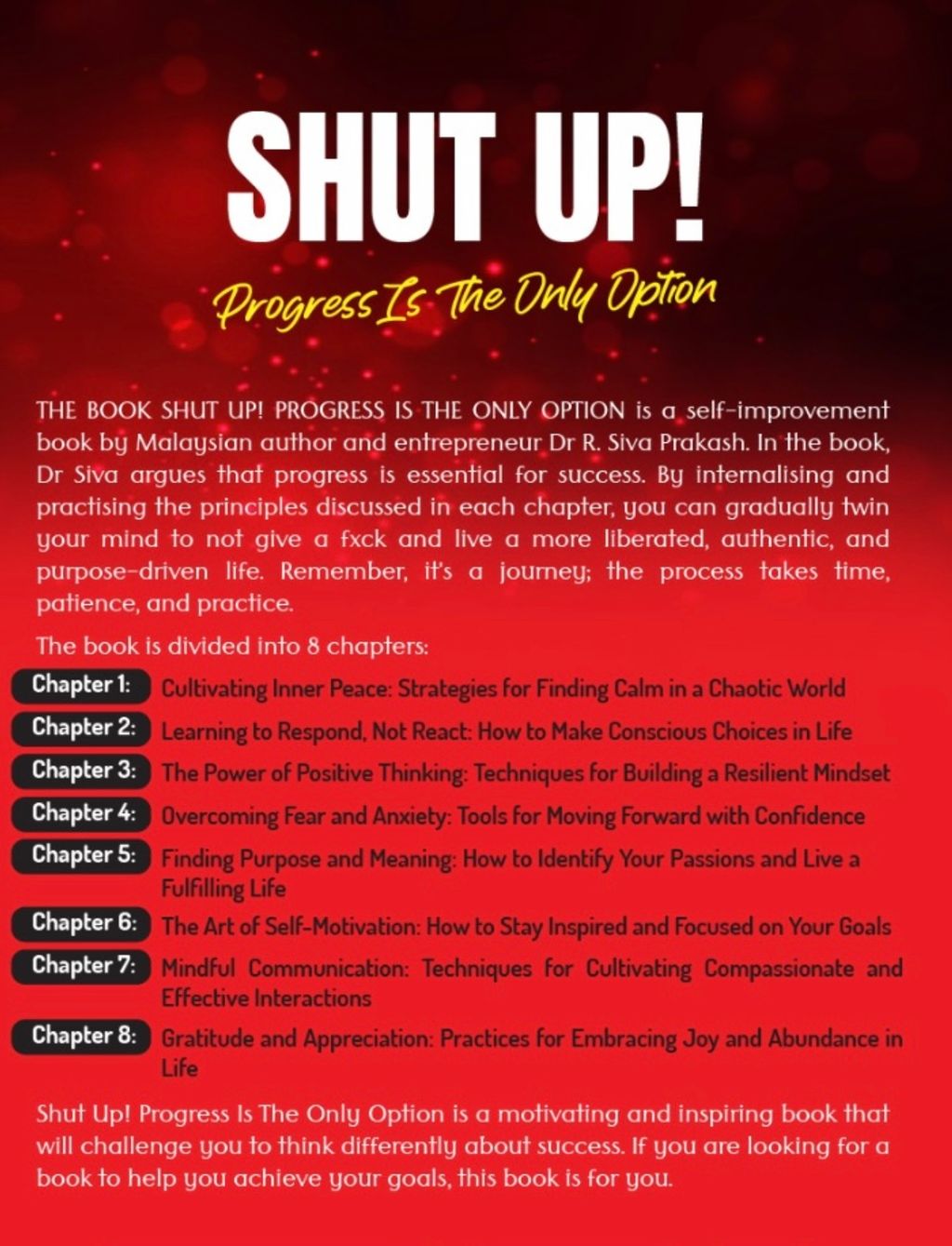 THE BOOK SHUT UP! PROGRESS IS THE ONLY OPTION is a self- improvement book by Malaysian author and entrepreneur Dr R. Siva Prakash. In the book, Dr Siva argues that progress is essential for success. By internalising and practising the principles discussed in each chapter, you can gradually twin your mind to not give a fxck and live a more liberated, authentic, and purpose-driven life. Remember, it's a journey; the process takes time, patience, and practice.